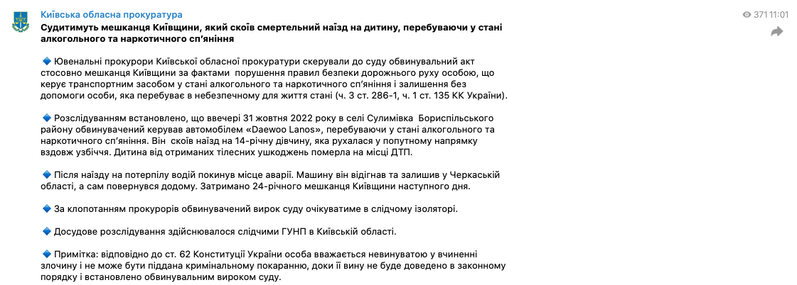 Прокуратура Киевской областной направила в суд обвинительный акт в отношении водителя, который в октябре прошлого года сбил насмерть ребенка, находясь в состоянии алкогольного и наркотического опьянения.