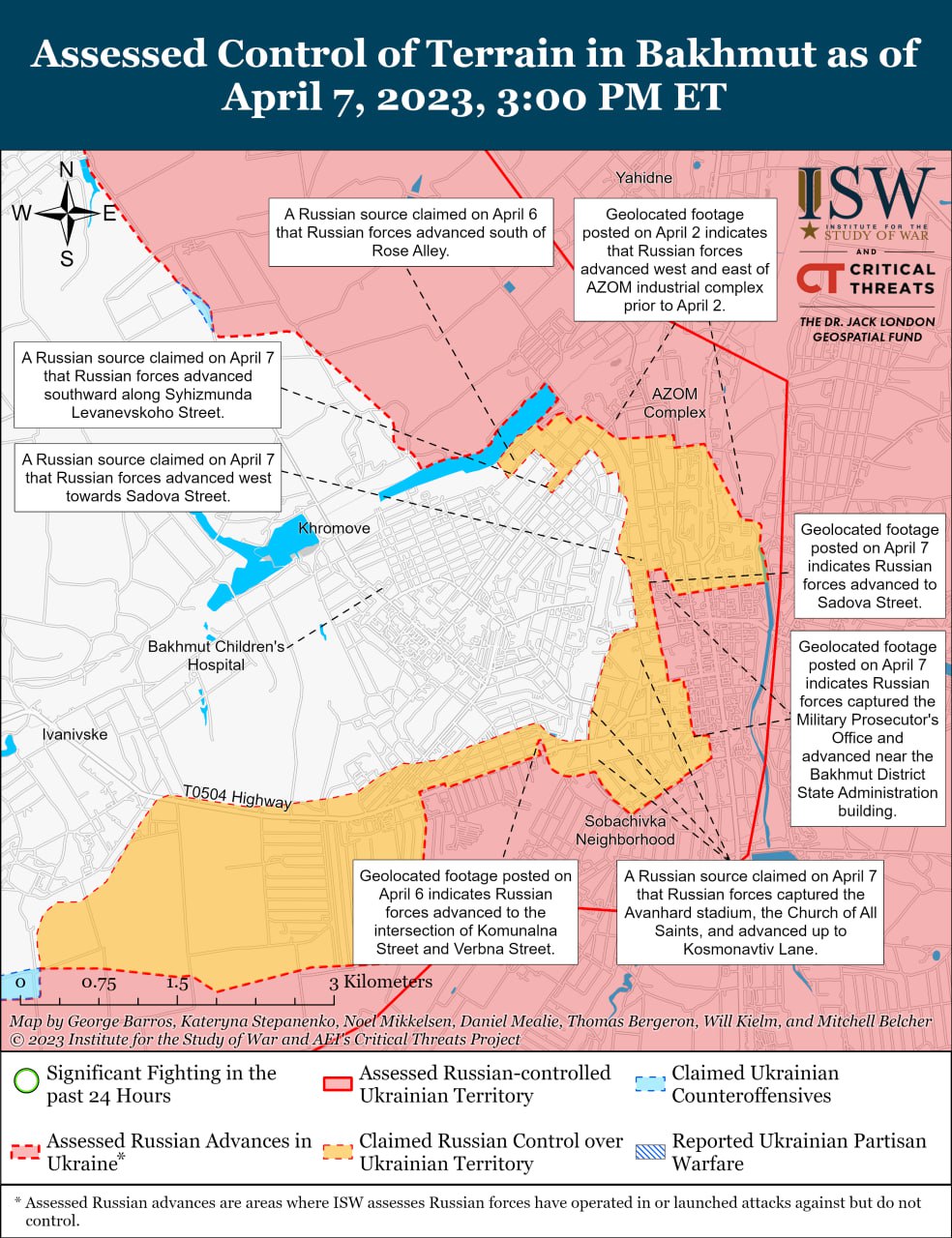 Также на кадрах с геолокацией, опубликованных 6 апреля, видно, что российские войска продвинулись примерно на три километра к югу от трассы Т0504 Константиновка — Часов Яр — Бахмут.