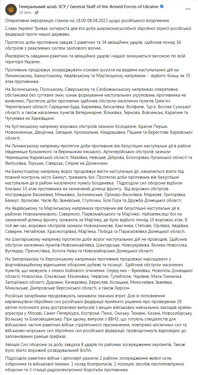 8.44 Генштаб публикует потери РФ по состоянию на 8 апреля.