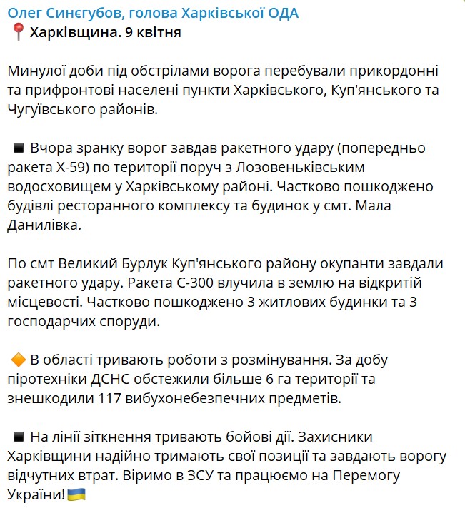 РФ за минувшие сутки нанесла ракетные удары по территории рядом с Лозовеньковским водохранилищем и поселком Большой Бурлук в Харьковской области. Предварительно, удары наносились ракетами Х-59 и С-300.