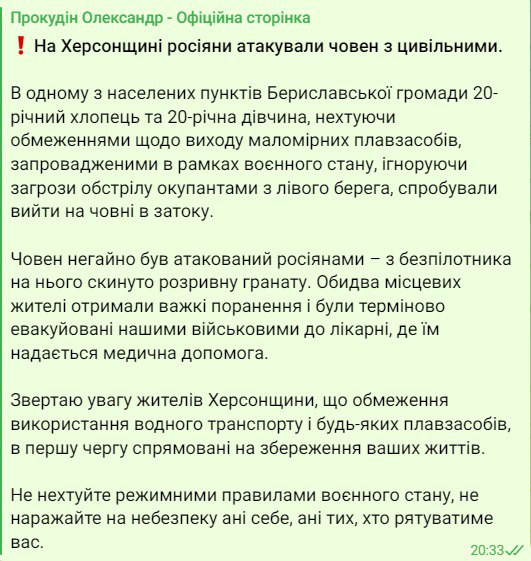 20.44 В Херсонской области россияне атаковали лодку с гражданскими.