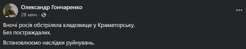 10.25 Ночью в Краматорске под обстрел попало кладбище, сообщил мэр города Александр Гончаренко.