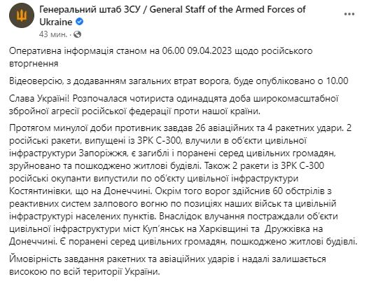 1. Силы РФ нанесли 26 авиационных и 4 ракетных удара. Две российские ракеты, выпущенные из ЗРК С-300, попали в объекты гражданской инфраструктуры Запорожья, погибли и ранены мирные жители, разрушены и повреждены жилые здания. Также 2 ракеты из ЗРК С-300 российские оккупанты выпустили по объекту гражданской инфраструктуры Константиновки. Кроме того, враг совершил 60 обстрелов из реактивных систем залпового огня по позициям ВСУ и гражданской инфраструктуры. В результате попадания пострадали Купянск и Дружковка.