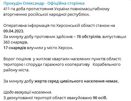 Об этом сообщает глава Херсонской ОВА Александр Прокудин.