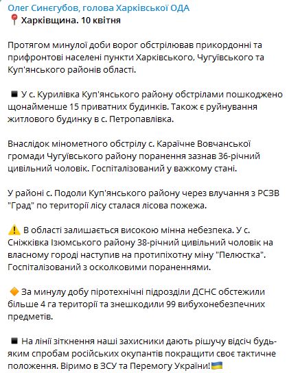 08.40 За прошедшие сутки враг обстреливал приграничные и прифронтовые населенные пункты Харьковского, Чугуевского и Купянского районов Харьковской области.