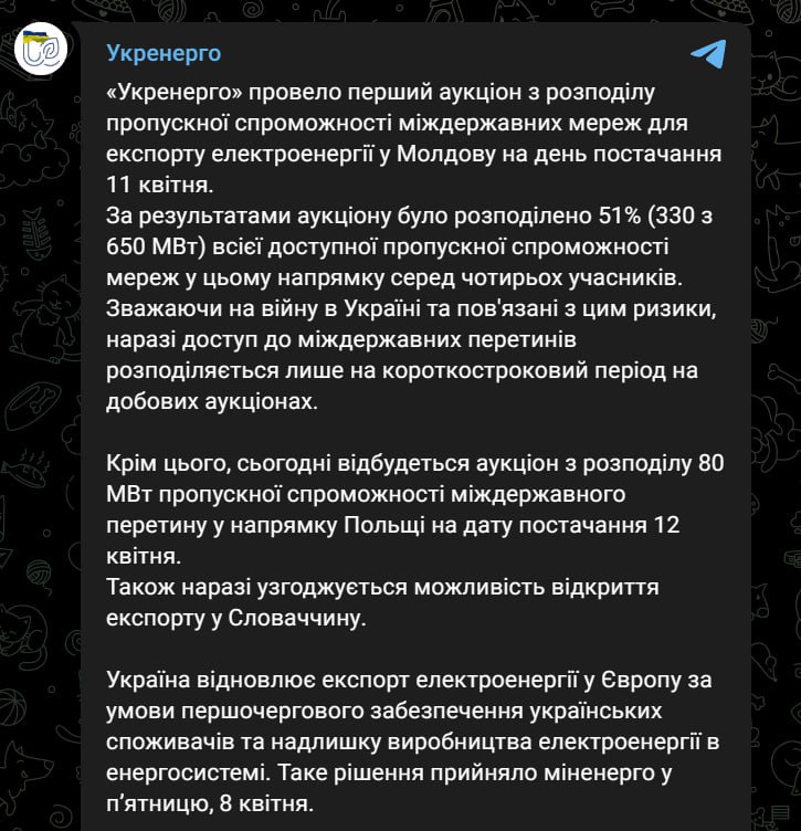 "Укрэнерго" провело первый аукцион по распределению мощностей для продаж в Молдову 11 апреля. Аналогичный аукцион сегодня пройдет по продаже света в Польшу на 12 апреля.