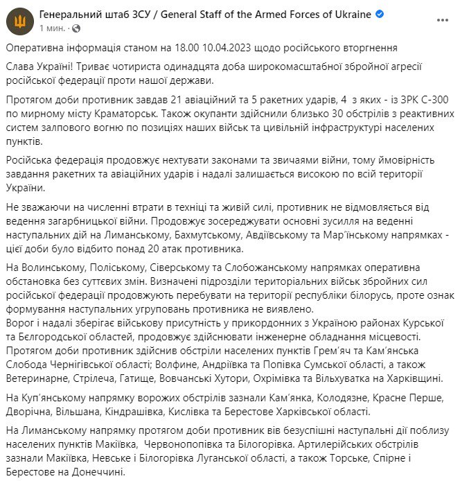 В понедельник, 10 апреля, в Украине идет уже 411-й день войны с Россией