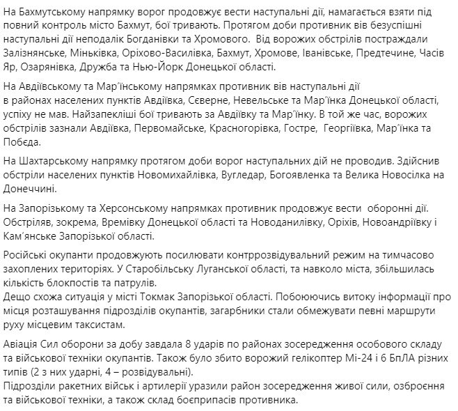 2. Противник продолжает сосредоточивать основные усилия на ведении наступления на Лиманском, Бахмутском, Авдеевском и Марьинском направлениях. За прошедшие сутки ВСУ отразили 58 атак на указанных направлениях.
