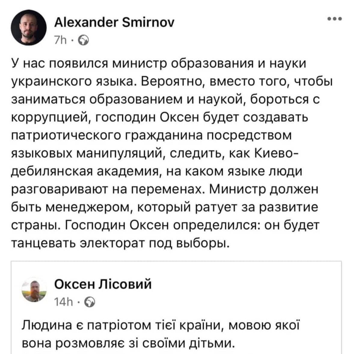 В соцсетях ширится скандал вокруг заявления министра образования Оксена Лисового о русском языке и реакции на него сооснователя известного рекламного агентства "Табаско" Александра Смирнова.