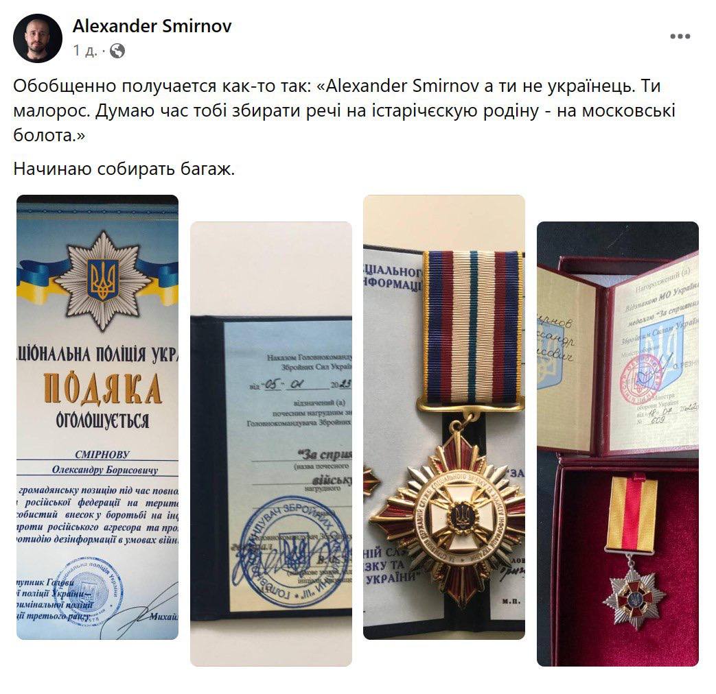 "Обобщенно получается так: "Александр Смирнов, а ты не украинец. Ты малоросс. Думаю время тебе собирать вещи на историческую родину – на московские болота". Начинаю собирать багаж", - написал Смирнов.