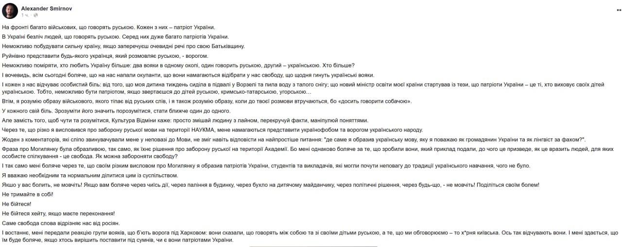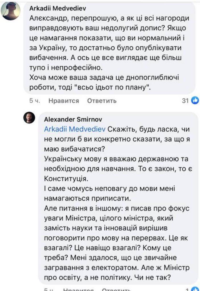 "За что я должен извиняться? Украинский язык я считаю государственным и необходимым для обучения... Но вопрос в другом: я писал о фокусе внимания министра, который вместо науки и инноваций решил поговорить о языке на переменах. Это зачем вообще?", - написал Смирнов в комментариях.