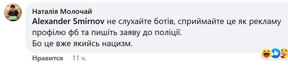 Часть людей его поддержала. "Не слушайте ботов и пишите заявление в полицию. Это уже какой-то нацизм", - написала Наталья Молочай из движения "Чесно".