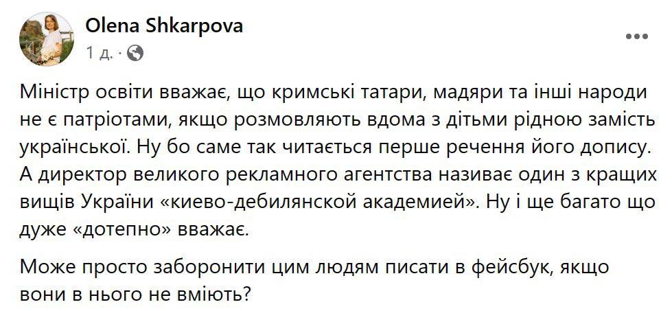 "Министр образования считает, что крымские татары, мадьяры и другие народы не патриоты, если разговаривают дома с детьми на родном языке вместо украинского... Не знаю, зачем Лисовой оскорбил всех патриотов Украины любой национальности, но так поступать не стоит", - пишет Елена Шкарпова.
