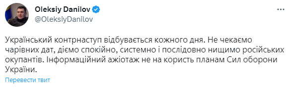 "Украинское контрнаступление происходит каждый день. Не ждем волшебных дат, действуем спокойно, системно и последовательно уничтожаем русских оккупантов. Информационный ажиотаж не в пользу планов сил обороны Украины" - написал он.