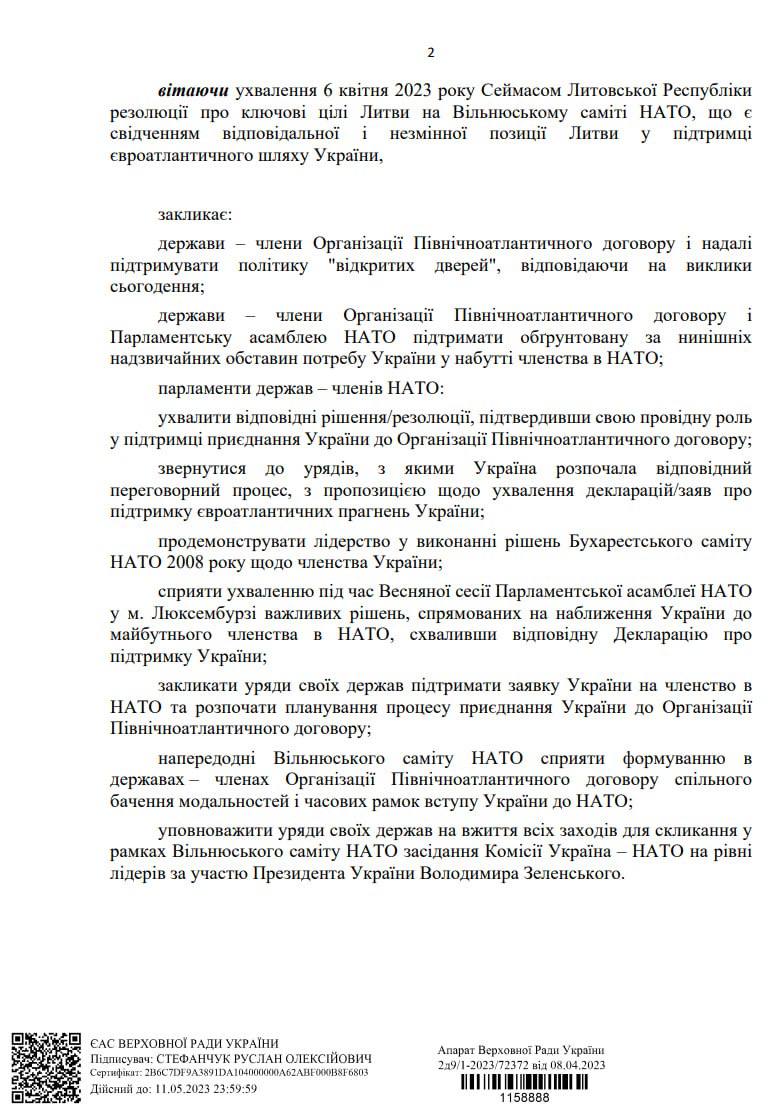 В частности, "содействовать принятию на весенней сессии Парламентской ассамблеи НАТО в Люксембурге важных решений, направленных на приближение Украины к будущему членству в НАТО, одобрив соответствующую Декларацию о поддержке Украины"
