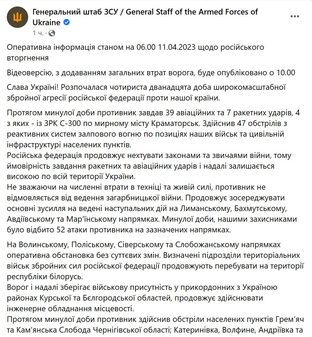 Во вторник, 11 апреля, в Украине идет уже 412-й день войны с Россией