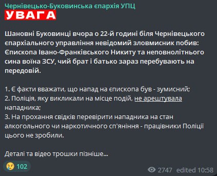 В Черновицко-Буковинской епархии сообщают, что "есть факты утверждать", что нападение было умышленным. Полиция нападающего не арестовала и не проверила его на предмет употребления наркотиков или алкоголя.
