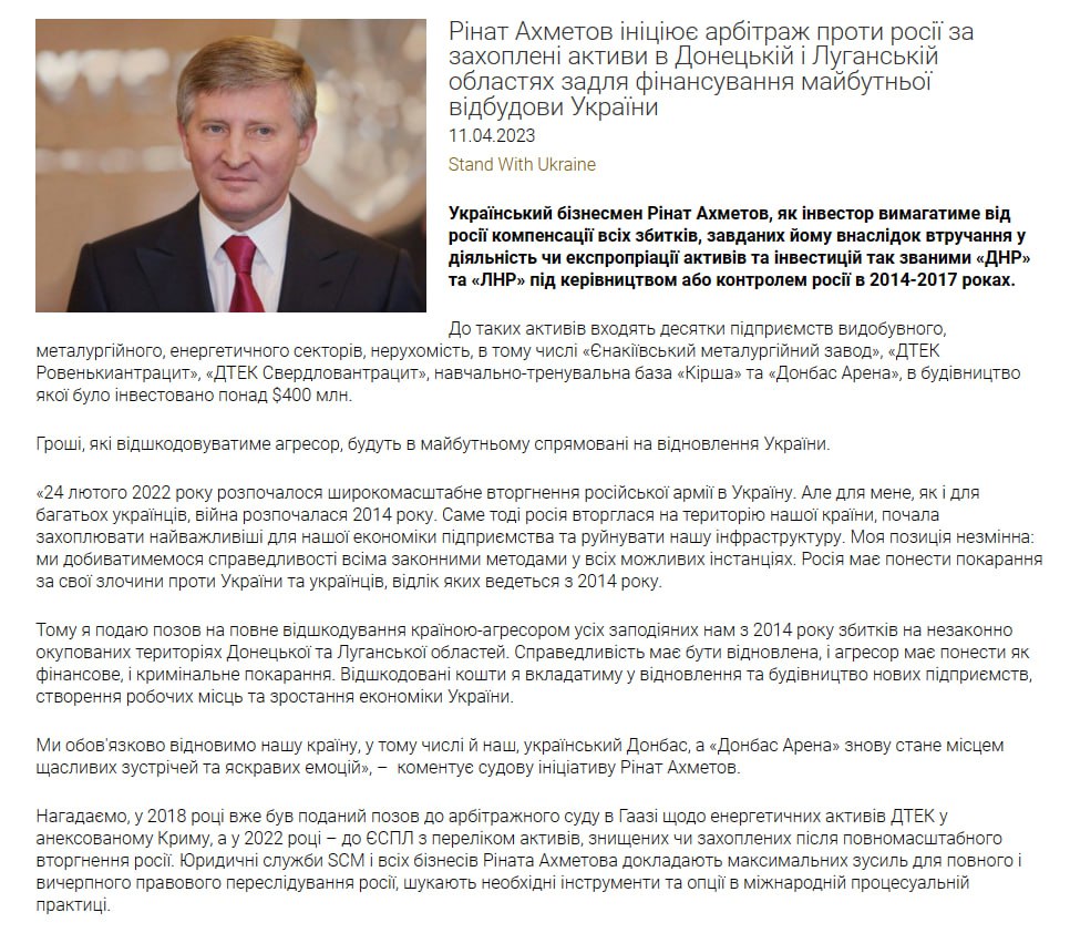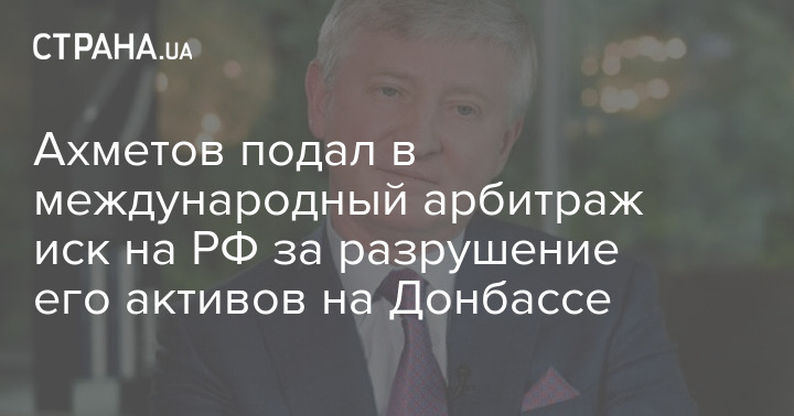 Украинский миллиардер Ринат Ахметов подает в международный арбитраж иск против РФ с требованием компенсировать убытки, причиненные ему "в результате вмешательства в деятельность или экспроприации активов и инвестиций так называемыми "ДНР" и "ЛНР" под руководством или контролем России в 2014-2017 годах".