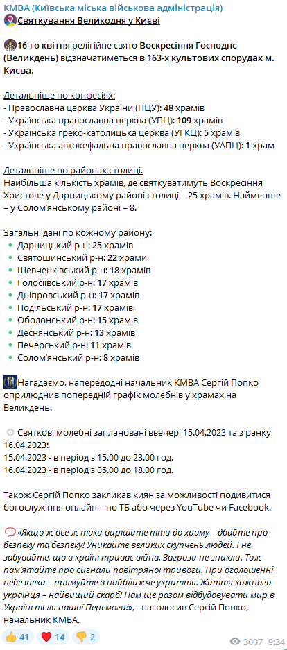 Как писала "Страна", в Киеве на выходных усилят меры безопасности из-за Пасхи. При этом в Пасхальную ночь не будут отменять комендантский час.