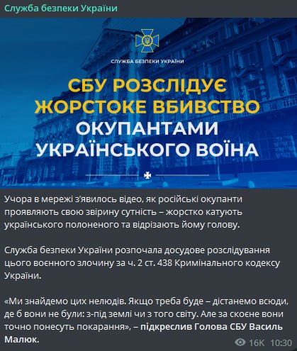 СБУ начала досудебное расследование по факту публикации видео, на котором украинскому солдату отрезают голову.