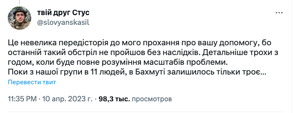 "Уже несколько недель регулярные войска со своими "Пионами" равняют все, что имело хоть какую-то форму и целостность. Пока из нашей группы в 11 человек, в Бахмуте осталось только трое", - написал вчера в Твиттере украинский боец с ником "твой друг Стус".