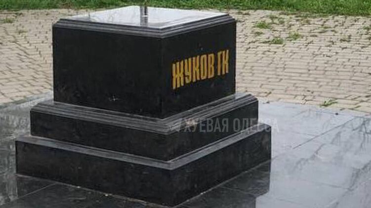 В Одессе местная жительница наклеила фамилию и инициалы советского полководца, маршала Советского Союза Георгия Жукова на место, где ранее был его памятник.