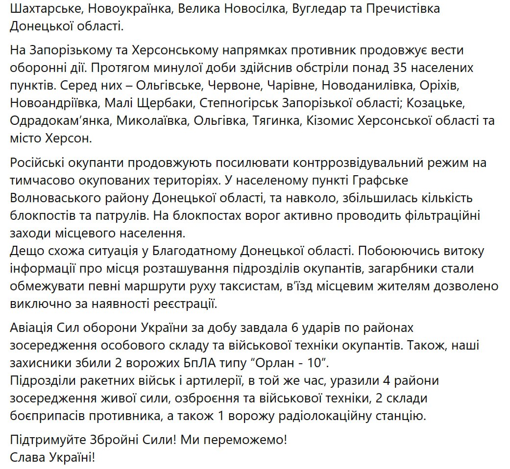 3. На Волынском, Полесском, Северском, Слободском, Купянском, Шахтерском, Запорожском и Херсонском направлениях обстановка без существенных изменений.