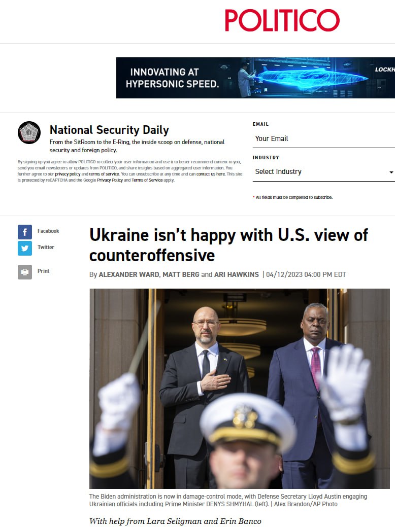 "Комментарии ясно дают понять, что Соединенные Штаты и Украина не так синхронизированы, как заявляют обе страны спустя 14 месяцев после начала войны", - пишет Politico.