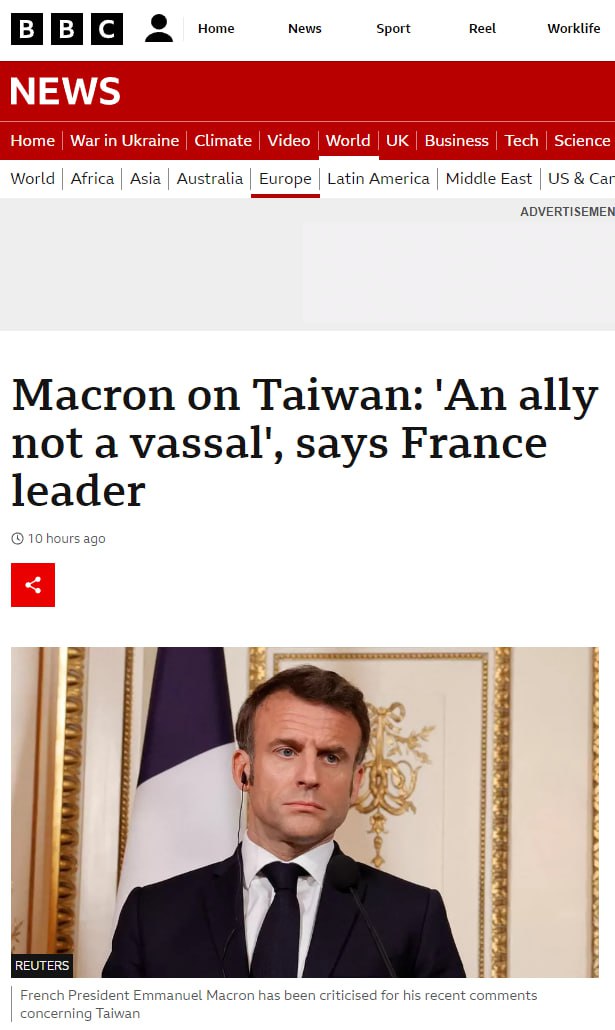 После полета в Китай Макрон стал больше говорить, что Европа не должна быть вассалом США. В частности, в интервью Politico заявлял, что Европа должна уменьшить свою зависимость от Соединенных Штатов и избежать втягивания в конфронтацию между Китаем и США из-за Тайваня.