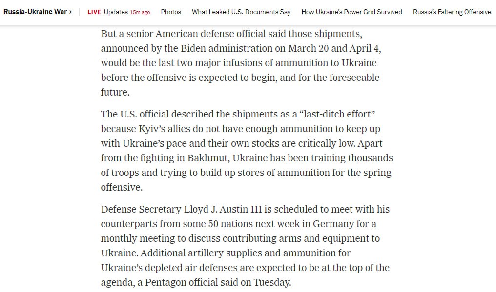 11.35 Пакеты военной помощи, о которых администрация Байдена объявила 20 марта и 4 апреля, - это последние крупные поставки боеприпасов Украине перед ожидаемым началом наступления, пишет New York Times со ссылкой на собеседников из Пентагона.
