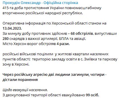 Об этом сообщил глава Херсонской ОВА Александр Прокудин.