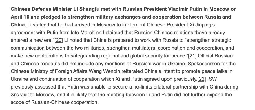 "Ранее ISW оценивало, что Путин не смог обеспечить неограниченное двустороннее партнерство с Китаем во время визита Си Цзиньпина в Москву, и, вероятно, встреча Ли и Путина не расширила сферу российско-китайского сотрудничества", - пишет ISW.