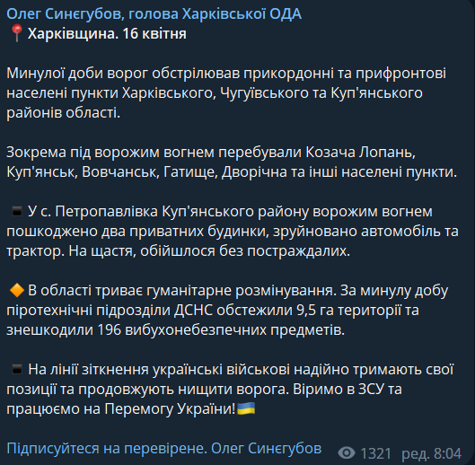 Также губернатор добавил, что в Харьковской области продолжается разминирование. За минувшие сутки пиротехнические подразделения ГСЧС обследовали 9,5 га территории и обезвредили 196 взрывоопасных предметов.