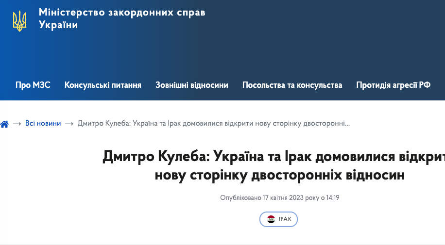 Министр иностранных дел Дмитрий Кулеба посетил Багдад, где провел переговоры с министром иностранных дел Фуадом Хусейном
