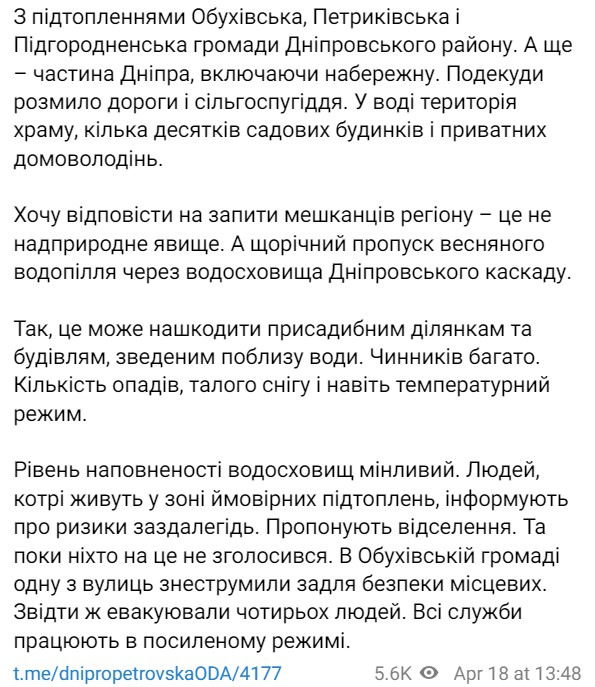 В Днепропетровской области затопило отдельные районы Обуховской, Петриковской и Подгороднянской громад, а также часть города Днепр, включая набережную.