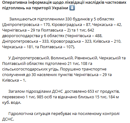 Остаются подтопленными 330 домов в 5 областях (Днепропетровская – 170, Кировоградская – 87, Черкасская – 42, Черновицкая – 29 и Полтавская – 2) и 1 тыс. 642 дворов хозяйств в 6 областях (Черниговская – 488, 3 Киевская – 210, Черкасская – 181 и Полтавская – 107).