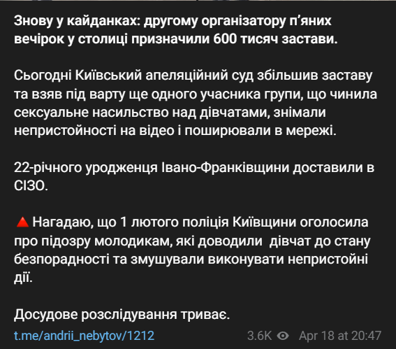 По его словам, сегодня Киевский апелляционный суд увеличил залог и заключил под стражу еще одного участника группы, которая совершала сексуальное насилие над девушками, снимали на видео и распространяли в сети.