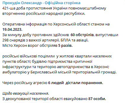 В Херсонской области было зафиксировано более 60 обстрелов, в том числе пять - в самом Херсоне. Пострадали жилые кварталы, предприятие критической инфраструктуры и амбулатория. Шесть человек получили ранения.
