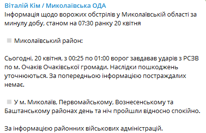 В Николаевской области из РСЗО ударили по Очакову, а также били по Николаевскому району.