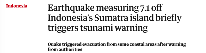 Землетрясение магнитудой 7,1 произошло в 170 км к юго-востоку от Телук-Далама на глубине 15 км, сообщила Геологическая служба США. Афтершоки были силой 5,8 балла.