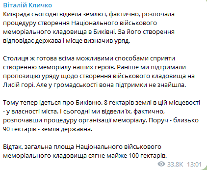 "Рядом - около 90 гектаров - земля государственная. Таким образом, общая площадь Национального военного мемориального кладбища достигнет почти 100 гектаров", - сообщил Кличко.
