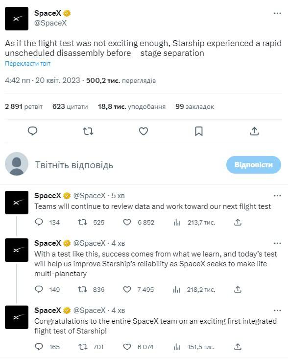 В SpaceX прокомментировали произошедшее. Там заявили, что работа над Starship продолжится, будут изучены проблемы, возникшие при отделении первой ступени.