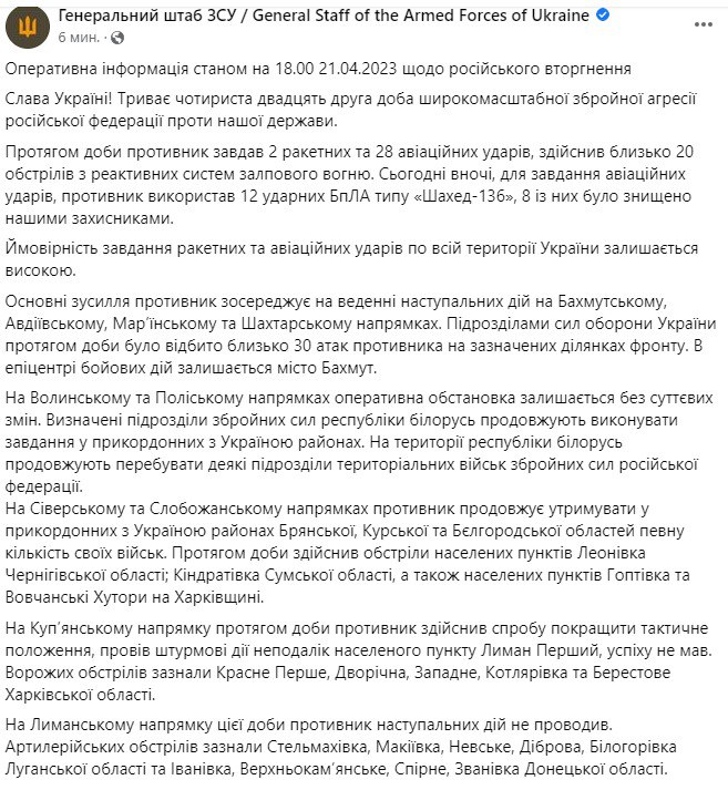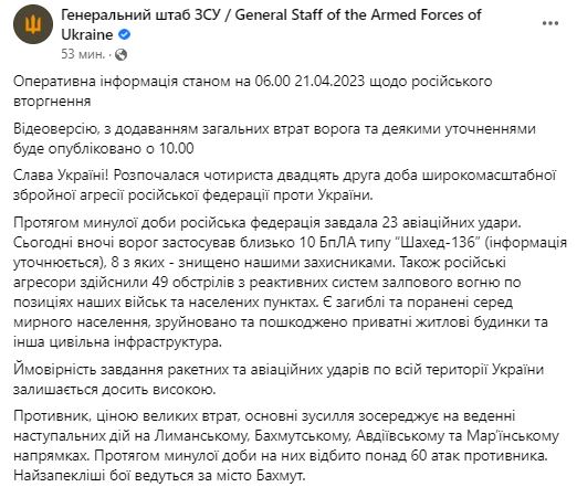 4. Противник сосредотачивает основные усилия на ведении наступления на Лиманском, Бахмутском, Авдеевском и Марьинском направлениях. За прошедшие сутки на них отражено более 60 атак противника. Самые ожесточенные бои ведутся за город Бахмут.