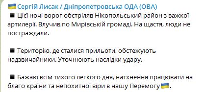 07.50 Ночью РФ обстреляла Никопольский район из тяжелой артиллерии. Пострадала Мировская громада. К счастью, люди не пострадали.