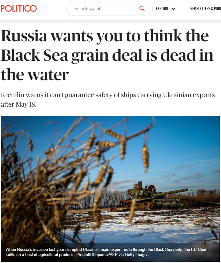 Кремль предупреждает, что не может гарантировать безопасность судов, перевозящих украинский экспорт после 18 мая и что регистрация судов будет продолжаться только до этой даты.
