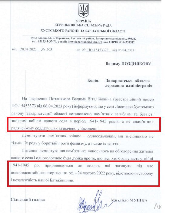 "Демонтируя памятник воинам-освободителям, мы обесцениваем не только их роль в борьбе против фашизма, но и саму их жизнь", - говорится в ответе жителей села Позднякову.
