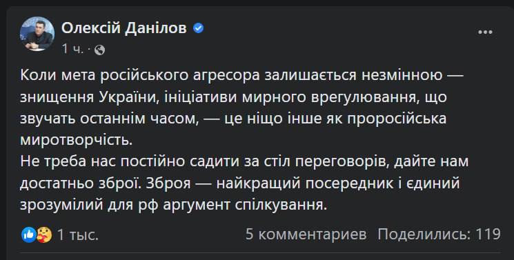 "Когда цель российского агрессора остается неизменной - уничтожение Украины, инициативы мирного урегулирования, звучащие в последнее время, - это ничто иное как пророссийское миротворчество. Не надо нас постоянно сажать за стол переговоров, дайте нам достаточно оружия. Оружие - лучший посредник и единственный понятный для РФ аргумент общения", - написал секретарь СНБО Украины Алексей Данилов.