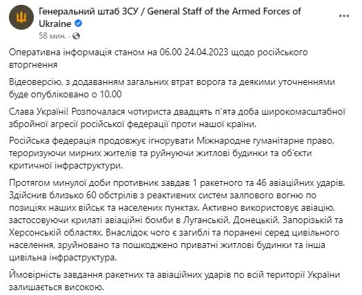1. За прошедшие сутки РФ нанесла 1 ракетный и 46 авиационных ударов. Совершила около 60 обстрелов из реактивных систем залпового огня по позициям ВСУ и населенным пунктам в Луганской, Донецкой, Запорожской и Херсонской областях. В результате есть погибшие и раненые среди гражданского населения, разрушены и повреждены частные жилые дома и инфраструктура.