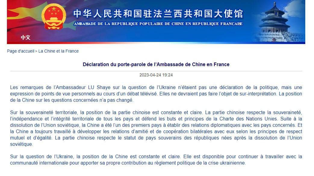 Посольство первоначально разместило всю стенограмму выступления посла Лу Шая на китайском и французском языках в своем официальном аккаунте WeChat.