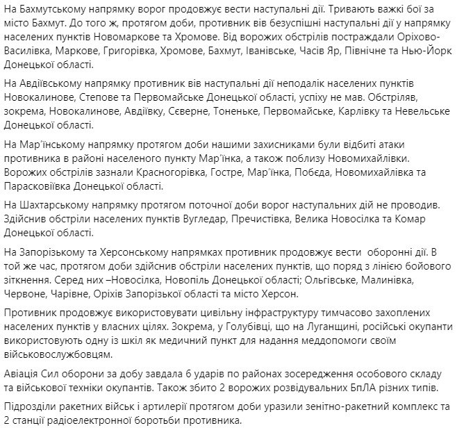2. Основные усилия противник сосредоточил на наступлении на Бахмутском, Авдеевском и Марьинском направлениях. Там отражены около 60 атак противника. Самые ожесточенные бои продолжаются за Бахмут и Марьинку.